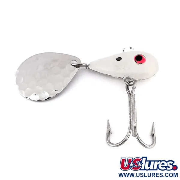 Tento tail spinner ve tvaru kapky o hmotnosti 1/2 oz (14 g) je těžká potápivá nástraha určená k lovu v hloubkách u členitého dna. Olověné tělo o délce 1 1/2" (4 cm) je opatřeno čistě bílým nátěrem, doplněným ručně malovanými očima s červeným lemováním a černými zorničkami. Tento model vyrobený společností Luhr Jensen pod kódem 10292 je vybaven niklovaným listem, který nabízí dvojí vizuální atraktivitu. Jedna strana listu je tepaná pro maximalizaci odlesků v různých světelných podmínkách, zatímco hladká zadní strana nese jasně vyražené jméno „LITTLE GEORGE“. Nástraha je ve stavu 5/5, zachovává si původní lesk laku i jasné kovové komponenty. Jeden ostrý trojháček je připevněn k břichu pomocí robustního drátěného skeletu procházejícího olověným tělem. Kompaktní profil a vysoká hustota jsou specificky navrženy pro daleké náhozy a rychlý propad k cíleným hejnům ryb ve sloupci nebo k dravcům u dna.