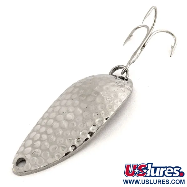 Tato klasická plandavka o hmotnosti 12 g (2/5 oz) se vyznačuje hluboce strukturovaným povrchem z tepaného niklu na své konvexní straně, který je navržen tak, aby zachycoval a odrážel světlo z mnoha úhlů. Tento exemplář o délce 5,5 cm (2 1/4") je model Little Jewel, historický kousek od Luhr Jensen, který se již dávno nevyrábí. Na konkávní straně nástrahy je jasně vyražen název výrobce, označení modelu „Little Jewel“, původ v U.S.A. a konkrétní označení hmotnosti. Kapkovitý tvar plandavky je určen pro nahazování i trolling a je osazen ostrým trojhákem ve stříbrném provedení. V zachovalosti 5/5 zůstává niklování jasné a vysoce reflexní na tepaném i hladkém povrchu. Na úzkém konci je umístěn přesně vyvrtaný otvor pro spojovací kroužek, zatímco kód produktu 11769 identifikuje tuto konkrétní plandavku často používanou rybáři při lovu pstruhů nebo lososů v různých podmínkách průhlednosti vody.