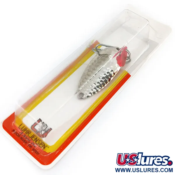 Hluboce texturované důlky na tepaném niklovém těle poskytují této 14g (1/2oz) plandavce vysoký lesk. Tato nepoužitá Luhr Jensen Little Jewel zůstává v původním průhledném blistru s klasickou červeno-žlutou grafikou z éry Hood River v Oregonu. Na zadním kroužku je vedle trojháčku namontováno malé červené plastové vábítko pro vytvoření vizuálního kontrastu. Nástraha o délce 5,5 cm (2 1/4") je identifikována produktovým kódem 9673 a SKU 1233-999-0101 na zadní straně karty. Zadní strana obalu také zobrazuje datum výroby 2005 a dvojjazyčné pokyny, což podtrhuje severoamerické dědictví tohoto vintage vybavení.