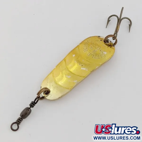 Značení zřetelně vyražené na pozlaceném povrchu identifikuje tento 7g (1/4 oz) exemplář jako klasický design švédského výrobce. Zlatá povrchová úprava odráží světlo na výrazném vlnitém stupňovitém profilu se třemi výraznými žebry, navrženými k rozrážení vody při plynulém přitahování. Na konkávní straně zůstává autentický vlis „LITTLE RUBY RECORD SWEDEN“ ostrý a čitelný. V přední části je upevněn vintažní soudkový obratlík, který vyvažuje bronzový trojháček v zadní části. Tento konkrétní předmět s produktovým kódem 24522 vykazuje dobře zachovalý povrch, který si zaslouží hodnocení stavu 4/5. Hladký vnitřek plandavky poskytuje konzistentní jasný záblesk, který doplňuje texturovaný vnějšek.