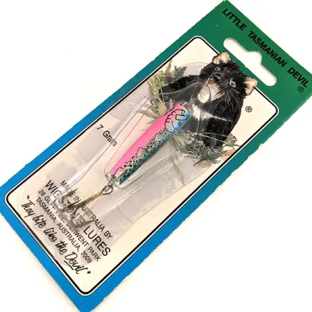 Tato nástraha Little Tasmanian Devil o hmotnosti 7 g (1/4 oz) je klasickým australským výrobkem od Wigston's Lures, navrženým pro širokou škálu technik nahazování a trollingu. Okřídlené tělo o délce 4 cm (1 1/2") je vyvedeno v pestrém vzoru Rainbow Trout, který se vyznačuje jasně růžovým hřbetem přecházejícím do modrostříbrného šupinového vzoru s jemnými černými tečkami. Jako nepoužitý kus (stav 6) zůstává bezpečně uložen v původním modrobílém blistru s ikonickým sloganem „They bite like the Devil“ a adresou 28 Gepp Parade odkazující na tasmánský původ. Na zadní straně obalu najdete podrobný návod k navázání pomocí karabinky s obratlíkem nebo přímým provlečením vlasce tělem nástrahy k háčku a korálku. Tento konkrétní model je katalogizován pod kódem 11568 a vyznačuje se tradičním tvarem s křidélky, který je pro značku typický již od jejího vzniku.