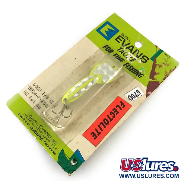 Tato plandavka Glen Evans Loco 2 o hmotnosti 7 g (1/4 oz) má výrazný fluorescenční žlutý okraj reagující na UV světlo. Plandavka o délce 5 cm (2") je opatřena stříbrným středem se vzorem šupin „Flectolite“, který zachycuje a odráží světlo ve vodním sloupci. Tento kus s kódem produktu 6700 je uchován v původním vintage blistru z Caldwellu v Idahu. Nástraha je nepoužitá, kov i povrchová úprava mají stejný lesk jako při opuštění továrny Gladding Corporation. Výbava zahrnuje jeden břišní trojhlan a pevný kroužek pro upevnění vlasce. Historicky se design Loco používal pro nahazování i trolling, často byl oblíbený pro lov štik a jiných dravců v mělkých vodách do hloubky 0,9 m. Zadní strana balení zdůrazňuje odkaz Glena L. Evanse – vyrábět náčiní určené k oklamání ryb, nikoli jen rybářů.