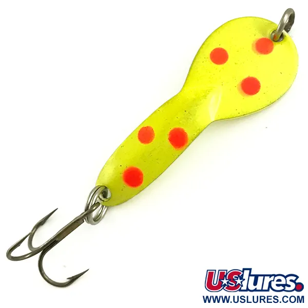 Šest výrazných červených bodů je precizně rozmístěno na fluorescenční žluté přední straně této 7g (1/4oz) plandavky Glen Evans Loco 2 UV. Tento model o délce 5 cm (2") se vyznačuje vysoce viditelnou povrchovou úpravou navrženou pro reakci na UV světlo, což je mimořádně účinné v kalné vodě nebo při nízké hladině osvětlení. Zadní strana odhaluje čistý niklový základ s vyraženým označením „LOCO 2“ u horního očka. Tato nástraha, konstruovaná pro nahazování i trolling, se obvykle používá k lovu štik v klidných vodách v hloubkách do 1 m (3,3ft). Tento exemplář pod kódem 5790 je ve stavu 5/5, přičemž lak i hardware nevykazují žádné známky použití. Pevné kroužky drží ostrý trojháček na ocase, čímž zůstává zachována originální tovární konfigurace.