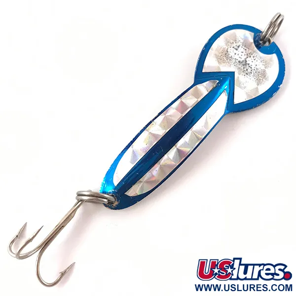 Na zadní straně kovového těla jsou jasně vyražena slova „GLEN L. EVANS LOCO 3“, což je znak kvality původní výroby v USA. Tato 17g (3/5 oz) plandavka měří 7 cm (2 3/4") a vyznačuje se nápadným barevným provedením Nickel / Blue, doplněným o geometrické prismatické pásky. Tyto reflexní prvky na zaoblené hlavě i zužujícím se těle jsou charakteristické pro sérii s produktovým kódem 4535. Rybáři tuto velikost obvykle používají pro přívlač nebo trolling v klidných vodách, zejména když se štiky zdržují v hloubkách kolem 1,0 m (3 ft). Osazení je velmi čisté, zahrnuje spojovací kroužek pro vlasec a ostrý trojháček na konci. Při hodnocení stavu 5/5 zůstává modrý povrch hluboký a sytý v kontrastu s jasným niklováním.