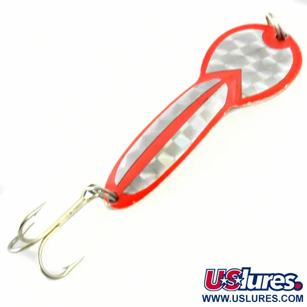 Tato klasická plandavka o hmotnosti 17 g (3/5 oz) se vyznačuje výraznou povrchovou úpravou ve fluorescenční oranžové a niklu s vloženým holografickým šachovnicovým vzorem. Na zadní straně těla o délce 7 cm (2 3/4") je vyražen název „LOCO“ a velikost „3“, což je charakteristický znak společnosti Glen Evans. Tento konkrétní kus, označený produktovým kódem 4610, je ve špičkovém stavu a za své čisté povrchy a zachovalé komponenty získal hodnocení 5/5. Je navržena pro nahazování i trolling a je vhodná zejména pro lov štik ve stojatých vodách v hloubkách do 1 m. Kovová konstrukce působí robustně a zářivě oranžový lem zůstává jasný i na reflexním niklovém podkladu. Na zádi je pomocí pevného kroužku připevněn jeden trojháček, připravený k okamžitému použití nebo k vystavení ve sbírce historického náčiní.