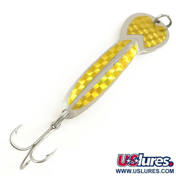 Poniklování na zadní straně poskytuje čistý, leštěný základ pro zářivý zlatý hologramový vzor na přední straně. Tato plandavka Glen Evans Loco 4 o hmotnosti 3/4 oz (23 g) a délce 3 1/2" (9 cm) nese produktový kód 6600 a představuje původní výrobu před akvizicí značky společností Luhr Jensen. Holografická páska má texturovaný geometrický design, který při vedení vodou vytváří výrazný vizuální záblesk. Jedná se o specializovaný nástroj pro nahazování a trolling, zvláště účinný při lovu štik v hloubkách do 1 m s minimálním proudem. Poniklované tělo i osazení jsou ve stavu 5/5, vykazují jasný lesk a ostrý, robustní trojháček. Název výrobce a označení modelu „Loco“ jsou jasně vyraženy do kovu poblíž očka pro uvázání vlasce.