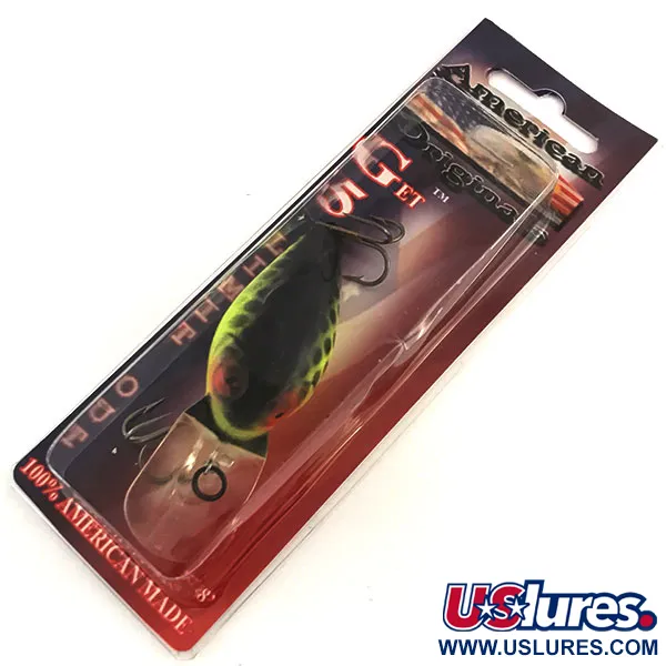 Tento 1/4oz (7g) wobler v vysoce kontrastním barevném provedení Black / Chartreuse je ukázkovým příkladem řady American Originals od Luck "E" Strike. Model Get 5 byl vyroben v závodě v Cassville v Missouri s cílem dokázat, že vysoce kvalitní nástrahy z tvrdého plastu lze vyrábět v USA za dostupnou cenu. Tento kus s produktovým kódem AOW11-110-1 měří 2 1/4" (5,5 cm) a je konstruován pro dosažení hloubek mezi 5' a 8' (1,5 - 2,4 m) při nahazování nebo trollingu. Vizuální detail na těle v barvě chartreuse zahrnuje tmavý šupinový vzor, který přechází v celočerný hřbet, na originálním obalu označený jako „CIT BLK BACK“. Nástraha zůstává nepoužitá v původním blistru, zachovává si svůj původní lesk a je vybavena ostrými trojháčky a čirou lopatkou. Obal zdůrazňuje logo „Team Luck 'E' Strike“, které připomíná specifickou éru 100% americké produkce.
