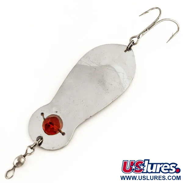 Broušený červený skleněný korálek tvoří výrazný středobod u očka této v Kanadě vyrobené plandavky Lucky Strike. Na zadní straně je jasně vyražena značka výrobce. Tento exemplář reprezentuje klasickou stříbrnou povrchovou úpravu, která se stala standardem v severoamerických rybářských krabičkách. S hmotností 25 g (1 oz) a délkou 8,5 cm (3 1/4") nabízí dostatečnou hmotnost pro přívlač i trolling. Tento konkrétní kus s kódem 12653 je ve stavu 4/5 a zachovává si jasný, reflexní povrch. Zajímavou úpravu najdeme na háčku: jeden hrot původního trojháčku byl záměrně odštípnut předchozím majitelem, aby se změnil na dvojhák, pravděpodobně pro snazší vedení v travinách nebo v kamenitých strukturách.