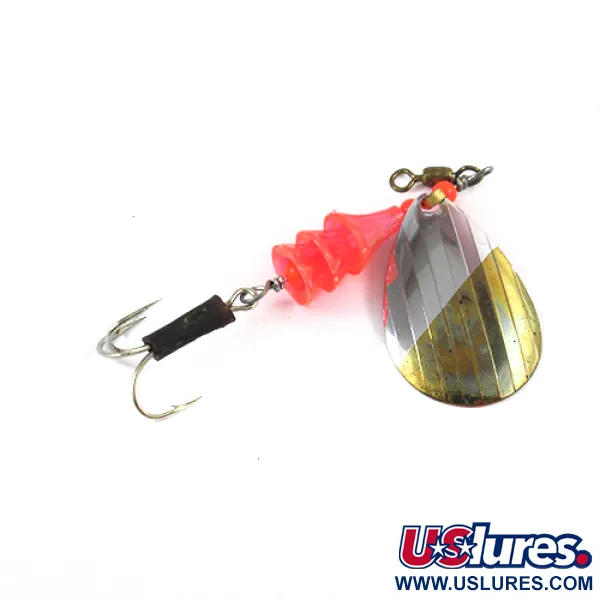 Tato klasická kanadská rotační třpytka o délce 8,25 cm (3 1/4 palce) od obratlíku k obloučku háčku se vyznačuje charakteristickým listem ve tvaru slzy. Přední strana listu má kombinovanou povrchovou úpravu z leštěného niklu a mosazi, zatímco zadní strana je opatřena sytě červeným lakem. Společnost Lucky Strike, tradiční výrobce kanadských rybářských potřeb, vyrobila model Coffee Spoon (kód produktu 2595) s lehkou gramáží 7 g (1/4 oz), která je vhodná pro lov různých druhů sladkovodních ryb. Průsvitné oranžové, odstupňované plastové tělíčko tvoří vizuální dominantu na drátěné ose, která vede k trojháčku opatřenému černou ochrannou bužírkou. Tento exemplář je ve stavu 4/5, s velmi zachovalým povrchem a čistými komponenty. Na předním očku je již připevněn mosazný soudečkový obratlík, který usnadňuje vedení vlasce při nahazování nebo trollingu.