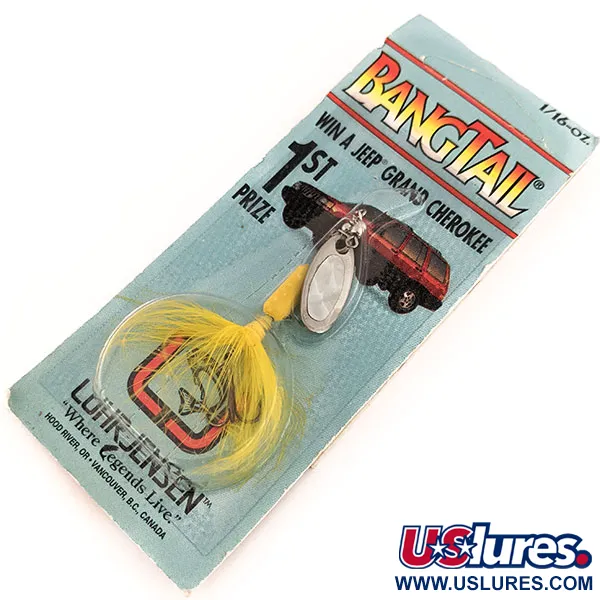 Tato vintage rotační třpytka o hmotnosti pouhých 1,8 g (1/16 oz) nese odkaz klasické výroby značky Luhr Jensen z Hood River v Oregonu. Profil o délce 5 cm (2") definuje zářivě žlutý péřový ocásek a ladící žlutý korpusový korálek v kombinaci s jasně stříbrným listem ve tvaru slzy. Tento exemplář s produktovým kódem 12684 zůstává v původním balení s ikonickou propagační akcí „Win a Jeep Grand Cherokee“. Na zadní straně karty je stále neporušený přihlašovací formulář do soutěže Bangtail a originální nálepka s čárovým kódem UPC. Jelikož je nástraha nepoužitá, je ve výjimečném stavu s hodnocením 6. Sestava obsahuje ostrý trojháček odborně ukrytý ve žlutém peří, což je typické pro tyto oblíbené lehké nástrahy určené pro lov okounovitých ryb a pstruhů. Obal vyzdvihuje historii značky ve Vancouveru v B.C. a Hood River a dokumentuje specifickou éru výroby rybářského náčiní na severozápadě USA.
