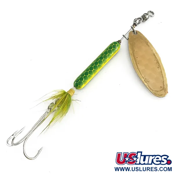 Zlatá povrchová úprava listu ve tvaru vrbového listu definuje tento vintage nález, který nese jasnou ražbu „BANG TAIL 6“ na svém povrchu v barvě mosazi. Tento model Luhr Jensen Bang Tail, identifikovaný pod kódem produktu 8411, se vyznačuje výrazným šupinatým vzorem včelí plástve na svém válcovém těle, které kombinuje lesní zeleň s jasně žlutým břichem. Třpytka o hmotnosti 17 g (3/5 oz) je postavena na robustním drátěném rámu typickém pro rybářské náčiní vyrobené v USA v této éře. Konec je vybaven trojháčkem s vázanými žlutými a zelenými vlákny, což vytváří texturovaný dráždivý prvek. Tento exemplář vykazuje vysokou úroveň péče, což odpovídá hodnocení stavu 4/5. Tepaná textura na vnitřní straně listu poskytuje jemný vizuální detail navržený tak, aby odrážel světlo při rotaci během plynulého přitahování.