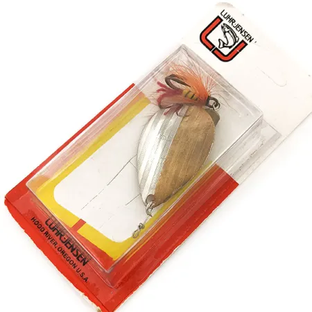 Tento historický model má velký list rozdělený na leštěné stříbro a hřejivou mosaz, což vytváří klasický dvoubarevný vzhled. Luhr Jensen Bear valley Dressed s produktovým kódem 12904 měří 8 cm (3 1/4") a váží 14 g (1/2 oz). Součástí je opeřený trojháček zdobený oranžovým a grizzly peřím, upevněným žluto-černým návinem. Tato nástraha byla vyrobena v Hood River v Oregonu v USA, je nepoužitá a zůstává továrně uzavřena v původním červeno-žlutém blistru. Na zadní straně karty je cenovka z února 1994 a informace o katalogu Luhr Jensen, což odráží historii společnosti v severozápadním Pacifiku.