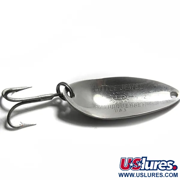 Odstupňované odstíny růžové, modré a hnědé definují vzor Rainbow Trout na této 5,5 cm (2 1/4") Luhr Jensen Little Jewel. Tato plandavka o hmotnosti 14 g (1/2 oz) s produktovým kódem 0159 je doplněna řadou výrazných černých teček na matně bílém podkladu, což napodobuje vzhled malého lososovité ryby. Tento v USA vyrobený exemplář je ve stavu 5/5, přičemž barva zůstává ostrá od tmavého hřbetu až po očko. Její výbava se skládá z jednoho trojháčku připevněného pomocí kroužku, což poskytuje pevné spojení pro nahazování nebo trolling. Tvar kapky je specificky vyvážen tak, aby si zachoval svůj profil ve vodě, zatímco barevné schéma zachycuje jemný přechod od jemné modré k teplému růžovému pruhu uprostřed kovového těla.