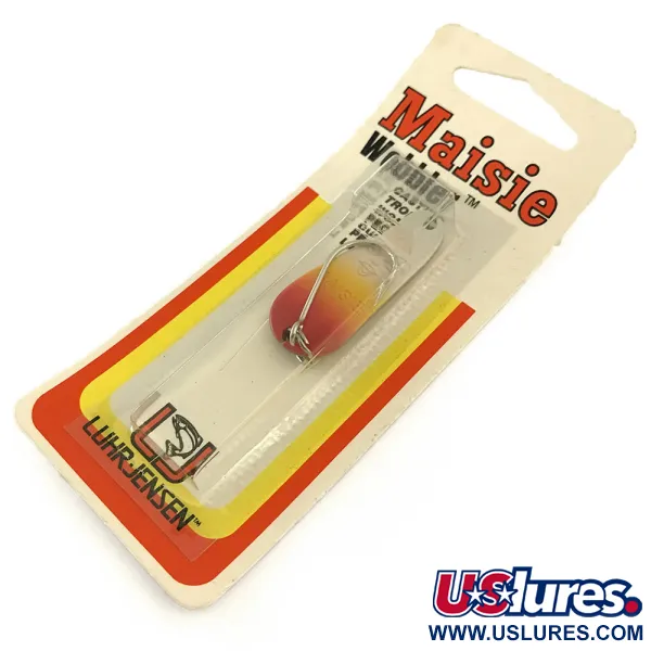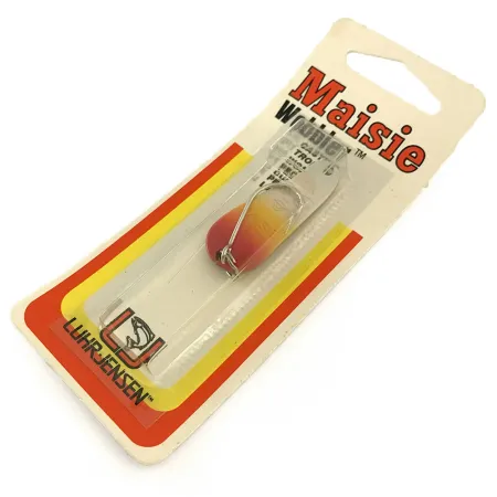 Tato plandavka Luhr Jensen Maisie o hmotnosti 7 g (1/4 oz) je výborně zachovalým kouskem rybářské historie severozápadu. Barevné provedení Shoshone/Brass tvoří výrazný červený přechod plynule přecházející do zlatožluté barvy na mosazném těle. S délkou 4 cm (1 1/2") je nástraha nepoužitá a zůstává v původním továrním balení. Zadní strana karty obsahuje detailní SKU štítek 1081-014-0603, který uvádí datum výroby 11. prosince 2003. Tento model, vedený pod produktovým kódem 18029, je osazen jednoháčkem a vysoce pevným spojovacím kroužkem. Obal zdobí ikonické logo Luhr Jensen s vyskakujícím pstruhem a potvrzuje výrobu v USA. Varování ohledně obsahu olova na zadní straně poskytuje pohled na materiály použité při konstrukci této plandavky v dané éře.
