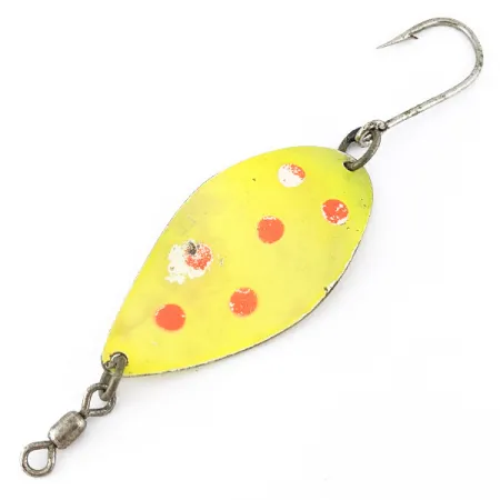 Povrchová úprava této plandavky Luhr Jensen Manistee 4 s výrazným žlutým základem a ručně malovanými červenými a bílými tečkami odráží její historii u vody. Tato plandavka s hmotností 14 g (1/2 oz) má prohnutý profil a robustní konstrukci, kterou tento americký výrobce navrhl speciálně pro lov lososů a pstruhů. Tento konkrétní kus s produktovým kódem 22595 vykazuje známky používání v podobě místy opotřebeného laku, což mu vysloužilo solidní hodnocení stavu 4/5. Osazení zůstává spolehlivé a zahrnuje jeden velký jednoháček a pevný sudový obratlík spojený pomocí kroužků. Série Manistee pocházející z USA je dlouhodobě oblíbená pro svou odolnou konstrukci a klasický kapkovitý tvar kovového těla. Červeno-žlutý vzor je tradiční volbou, která je dobře viditelná v různě zakalené vodě, a podtrhuje řemeslné zpracování, kterým je značka Luhr Jensen proslulá.