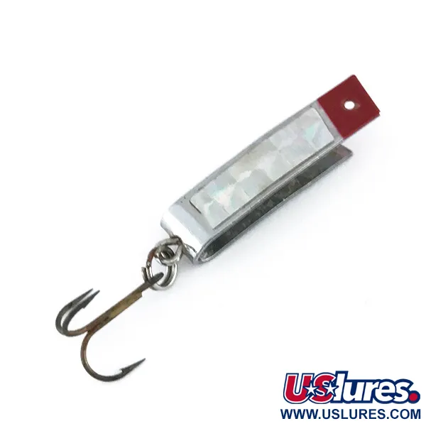 S lehkou váhou 2,3 g (3/32 oz) je model Super-Duper 501 vybaven leštěným niklovým povrchem, který je navržen tak, aby vytvářel odlesky v celém vodním sloupci. Tento konkrétní exemplář s kódem produktu 8018 představuje klasické kovové tělo ve tvaru písmene „U“, které společnost Luhr Jensen vyrobila v USA. Jedna strana 3cm (1 1/4") rámu je doplněna prismatickou páskou s čtvercovým vzorem, která vytváří holografický kontrast kovu. Sytě červený hrot u očka pro navázání vlasce slouží jako tradiční bod útoku, který se na těchto vintage kouscích často vyskytuje. Druhá strana zůstává čistým, leštěným kovovým povrchem, kde jsou do niklu jasně vyraženy značky výrobce. Veškerý originální hardware, včetně kroužku a trojháčku, vypadá zachovale, což odpovídá hodnocení stavu 5/5. Bronzový trojhák je připevněn k zadnímu ohybu unikátního profilu nástrahy.