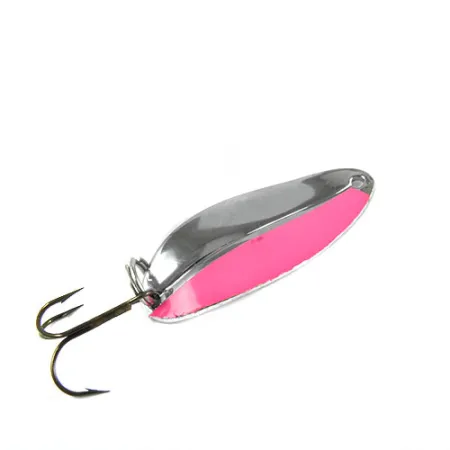 Tento 5 cm (2") dlouhý exemplář představuje klasické americké kovoobrábění TODDCO Main Liner, identifikované pod produktovým kódem 0392. Plandavka má vysoce leštěný niklový povrch doplněný výraznými sytě růžovými pruhy na vnější straně, což je barevná kombinace navržená pro dobrou viditelnost v různých podmínkách čistoty vody. S hmotností 11 g (2/5 oz) je její robustní profil spárován s pevným kroužkem a ostrým trojháčkem, což jsou typické znaky účelného designu výrobce. Tato konkrétní nástraha z USA je ve stavu 5/5 a vykazuje čistý, lesklý povrch svého kapkovitého těla. Kontrast mezi reflexním stříbřitým kovem a sytou růžovou barvou zůstává ostrý a jasně definovaný.