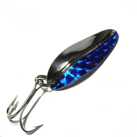 Výrazná kombinace leštěného niklového základu a modré prizmatické fólie definuje vizuální charakter tohoto exempláře vyrobeného v USA. Tato plandavka Toddco Main liner o hmotnosti 11 g (2/5 oz) je typickým příkladem konstrukce plandavek z poloviny století. List o délce 5 cm (2 palce) se vyznačuje osobitou povrchovou úpravou „půl na půl“, kde se reflexní nikl potkává s modrou vzorovanou páskou. Nástraha se nachází v nepoužitém stavu (5/5) a zachovává si svůj původní tovární lesk na kovových površích i lepicí pásce. Výbavu tvoří stříbřený trojhák spojený v zadní části kroužkem. Tato v USA vyrobená nástraha s produktovým kódem 0412 představuje přímočaré inženýrství, které Toddco používalo pro své plandavky. Konkávní spodní strana lžíce je vyvedena ve stejném leštěném niklu, což umožňuje stálé odlesky z různých úhlů.