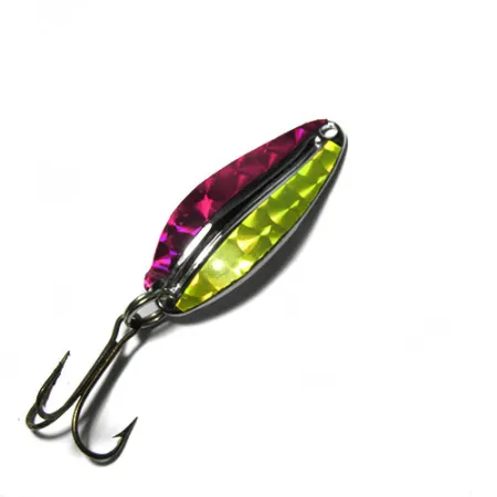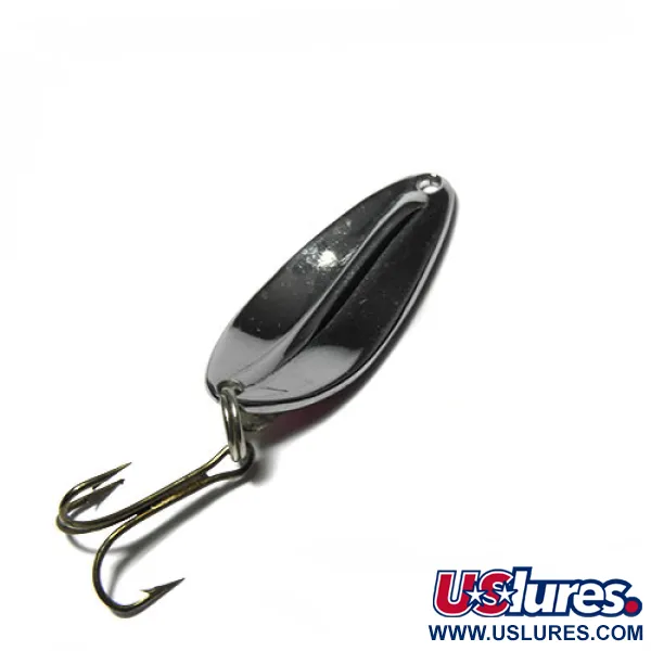 Niklové, tmavě červené a fluorescenční žluté hologramové segmenty vytvářejí na plandavce Main liner výrazný vizuální vzor. Tato americká nástraha od TODDCO o délce 4 cm (1 1/2") a hmotnosti 7,5 g (1/4 oz) je postavena na leštěném niklovém základu navrženém pro maximální odlesky. Produktový kód 0414 představuje klasický profil určený pro přívlač nebo trolling, vybavený robustním kroužkem a bronzovým trojháčkem. Povrchová úprava je mimořádně zachovalá, což odpovídá hodnocení stavu 5/5 bez viditelných vad na hologramové fólii nebo kovových hranách. Ražba na zadní straně vykazuje preciznost typickou pro rybářské náčiní vyráběné v USA v této éře, což zajišťuje strukturální integritu plandavky.