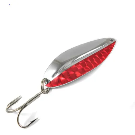 Tato plandavka o hmotnosti 14 g (1/2 oz) s leštěným niklovým povrchem představuje klasické americké řemeslo od TODDCO. Main Liner o délce 5,5 cm (2 1/4"), označený kódem produktu 0785, má na přední straně charakteristický dvoubarevný design. Jedna podélná polovina listu si zachovává jasný stříbrný lesk, zatímco druhá strana je pokryta zářivě červenou prismatickou páskou. Zadní strana zůstává plně leštěná v niklu, což zvýrazňuje středové žebro, které dává nástraze její tuhý profil. Tento kus je vybaven čistým trojháčkem a kroužkem, vhodným pro těžkou přívlač nebo trolling. Všechny povrchy jsou u tohoto kusu v kondici 5/5 vysoce reflexní, včetně původního lepidla na červené pásce.