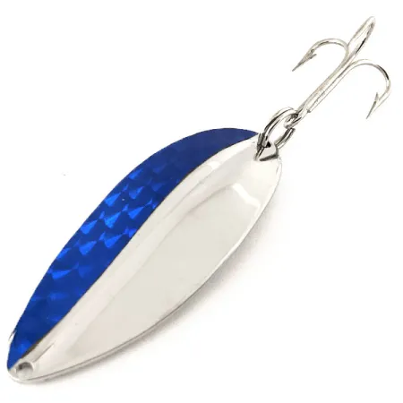 Tento TODDCO Main liner o délce přesně 6,5 cm (2 1/2") představuje design, který byl až do roku 1980 základem amerických rybářských boxů. Jeho dělená povrchová úprava Nikl / Modrá je obzvláště pozoruhodná; polovina konvexní strany je opatřena modrou prismatickou páskou, která odráží světlo skrze ostrý geometrický vzor. Podkladový kov tvoří jasný, leštěný nikl, který přechází až na zcela stříbrnou konkávní stranu. Tento model s produktovým kódem 11844 váží 21 g (3/4 oz), což z něj činí solidní volbu pro daleké nahazování. Osazení tvoří jeden velký trojháček připevněný robustním kroužkem, zatímco očko pro vlasec v hlavové části je jednoduchý, čistě vyvrtaný otvor. Jako dobře zachovalý kus americké rybářské historie je stav této plandavky hodnocen 5/5, přičemž si zachovává vysoký lesk kovu i dekorativní modré vložky.