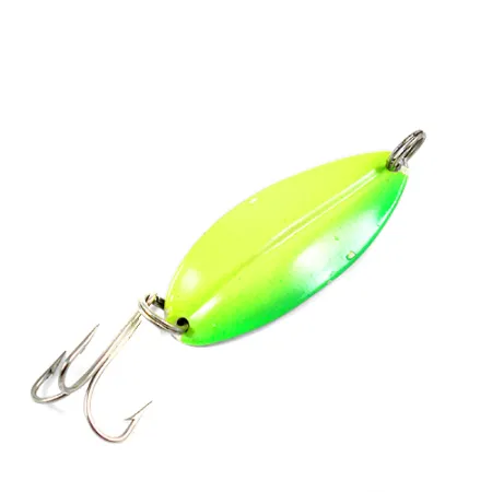 Fluorescenční žlutá přechází do jasně zelené na horní straně této 2 1/4" (5,5 cm) plandavky Main liner. Tato nástraha vyrobená americkým výrobcem TODDCO pod kódem 1989 je pozoruhodným nálezem pro sběratele, protože značka již neexistuje. S hmotností 1/2 oz (14 g) využívá design klasický konvexní tvar spojený s leštěnou niklovou zadní stranou, což vytváří vysoce kontrastní vizuální profil při nahazování nebo trollingu. Součástí výbavy je ostrý trojháček a kroužky, které zůstávají ve vynikajícím stavu s hodnocením 5/5. Každý aspekt továrního laku a kovového pokovení zůstává dobře zachován a vykazuje kvalitní řemeslné zpracování typické pro klasické rybářské náčiní vyrobené v USA.