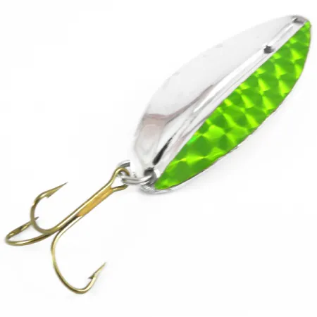 S váhou 2/5 oz (11 g) je TODDCO Main liner typická americká plandavka vyrobená před rokem 1980. Tento exemplář o délce 2 1/4" (5,5 cm) se vyznačuje výraznou povrchovou úpravou Nikl / Zelená, kde je na polovinu reflexní plochy nanesen jasně zelený voštinový vzor. Osazení zahrnuje robustní trojhák ve zlatém tónu připevněný spojovacím kroužkem, bez jakýchkoli známek opotřebení. Nástraha s produktovým kódem 3670 je ve stavu 5/5, přičemž leštěný nikl na zadní straně zůstává lesklý a bez škrábanců. Tato nástraha vyrobená v USA ukazuje odolnou konstrukci a jednoduchou, účinnou estetiku, která definovala značku TODDCO před ukončením její výroby. Čisté linie a kontrast mezi neonově zeleným vzorem a chromu podobným niklovým povrchem z ní činí vynikající kousek pro každou sbírku vintage rybářského vybavení.