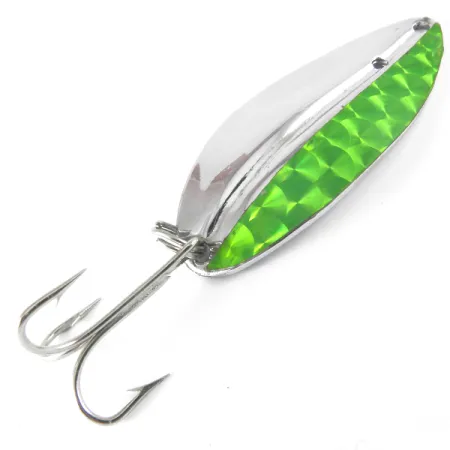 Tato kovová třpytka v jasném niklovém provedení s výraznou zelenou prismatickou páskou představuje řemeslnou práci americké společnosti TODDCO z poloviny minulého století. S délkou 5,5 cm (2 1/4") a váhou 12,5 g (2/5 oz) má Main liner kapkovitý tvar určený pro přívlač i trolling. Tento konkrétní model s produktovým kódem 3737 nese na jedné straně reflexní vzor šupin, zatímco zadní strana zůstává z leštěného, hladkého niklu. Tyto nástrahy vyráběné až do roku 1980 jsou klasikou pro ty, kteří oceňují historii amerického rybářského náčiní. Součástí je robustní, lesklý trojháček připevněný k zadní části pomocí kroužku. V aktuálním stavu 5/5 vykazuje nástraha skvěle zachovalý povrch, kde zelená prismatická vložka pevně drží a zachovává si svůj původní lesk.