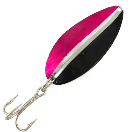 Váha 21 g (3/4 oz) poskytuje nástraze Toddco Main Liner značnou hustotu pro trolling v hlubokých vodách nebo daleké nahazování. Tato 6,5 cm (2 1/2") plandačka ve tvaru vrbového listu vykazuje ostré, podélné rozdělení barev na přední straně, s tmavě červenou metalickou stranou vyváženou pevnou černou polovinou. Středem prochází leštěný niklový šev, který zrcadlí celoniklonevou povrchovou úpravu na zadní straně kovu. Tato americká nástraha, označená produktovým kódem 7337, představuje klasickou éru výroby Toddco, která skončila v roce 1980. Koncové vybavení tvoří ostrý trojháček zajištěný kroužkem a celkový stav je hodnocen 5/5. Lisované očko v horní části je čistě vyvrtané pro přímé navázání vlasce nebo karabinky.