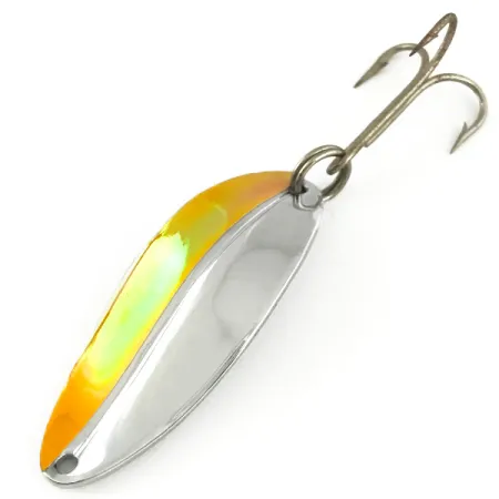 Poniklování na jedné straně poskytuje vysoce reflexní kontrast k oranžové s duhovými odlesky na straně druhé, díky čemuž je tento model Main liner (kód 7367) výrazným kouskem do sbírky. Tato plandavka, vyrobená společností TODDCO v USA před rokem 1980, váží 11 g (2/5 oz) a měří 5 cm (2"). Jako exemplář ve stavu 6 je nástraha nepoužitá a zachovává si původní povrchovou úpravu bez známek opotřebení. Reflexní duhové tóny na oranžové straně dodávají klasickému profilu třpytky vizuální hloubku. Robustní osazení, včetně ostrého trojháčku a kroužku, odráží funkční designové principy běžné u klasického amerického náčiní. Kapkovitý tvar je základem řady TODDCO a je navržen pro odolnost při nahazování i trollingu.