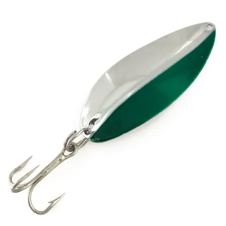 Tato kovová plandavka o hmotnosti 3/4 oz (21 g) se vyznačuje klasickým americkým profilem, který byl základem rybářských boxů až do ukončení výroby v roce 1980. TODDCO Main Liner, katalogizovaný pod produktovým kódem 7486, měří 2 1/2" (6,5 cm) a na své konvexní straně představuje nápadnou dvoubarevnou povrchovou úpravu Nikl / Zelená. Sytě zelená barva je precizně nanesena na jednu polovinu nástrahy, což vytváří vysoce kontrastní vzhled vůči leštěnému niklu. Na konkávní zadní straně vykazuje plandavka jednotný stříbřitý povrch. Tento konkrétní exemplář je ve stavu 5/5, zachovává si jasný lesk kovu a sytý pigment na lakované části. Osazení tvoří pevný kroužek a ostrý, originální trojháček. Nástraha vyrobená v USA je robustním příkladem designu pro přívlač a trolling z poloviny století a vykazuje čisté linie typické pro výrobní standardy TODDCO.