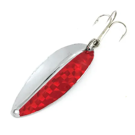Niklovaný a červený povrch určuje estetiku této vintage americké plandavky vyrobené firmou Toddco. Model Main liner, označený produktovým kódem 9377, se vyznačuje výrazným podélným žebrem uprostřed listu, které zajišťuje strukturální stabilitu. Nástraha o délce 5,5 cm a hmotnosti 12,5 g se skládá z kovového těla ve tvaru listu, které má na jedné polovině vysoce lesklý niklovaný povrch a na druhé červenou holografickou kostkovanou nálepku. Tento konkrétní kus odráží řemeslnou zručnost z éry před ukončením výroby Toddco kolem roku 1980 a udržuje si hodnocení stavu 5/5. Součástí je originální stříbřitý kroužek spojený se standardním trojháčkem, zatímco špička je vybavena čistým úchytem pro návazec nebo karabinku.