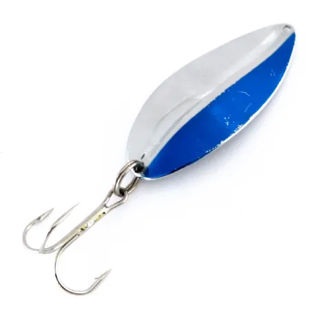 Přední strana této plandavky, rozdělená středem, nabízí vysoce viditelný kontrast mezi reflexním niklováním a tmavě modrým smaltem. Plandavka TODDCO Main liner, kód produktu 9981, vyráběná v USA do roku 1980, vykazuje klasický profil ve tvaru listu vhodný pro různé aplikace při nahazování i trollingu. Kovové tělo o hmotnosti 21 g (3/4 oz) poskytuje značnou hustotu pro svůj 6,5 cm (2 1/2") rám, doplněný velkým trojhákem zajištěným robustním kroužkem. Zatímco přední strana je dvoubarevná, zadní strana je po celé délce dokončena jednotným leštěným niklem. Tento konkrétní kus zůstává ve vynikajícím stavu, což odpovídá hodnocení 5/5. Jediné očko pro vlasec se nachází na zúžené špičce 6,5 cm (2 1/2") plátu.