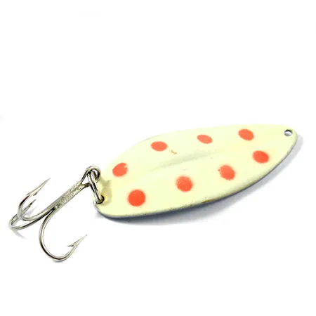 Fluorescenční červené tečky doplňují ve tmě svítící bílý povrch této TODDCO Main liner Glow, klasické plandavky americké výroby. Při hmotnosti 3/4 oz (21 g) se nástraha vyznačuje výrazným vyvýšeným středovým žebrem, které definuje její profil a dodává kovovému tělu tuhost. Přední strana je pokryta silnou vrstvou světelného pigmentu určeného pro prezentaci při slabém osvětlení nebo v hluboké vodě, zatímco zadní strana vykazuje čistý, leštěný niklový povrch. S délkou 6,5 cm (2 1/2") se osazení skládá z jednoho silného trojháčku zajištěného v zadní části vysoce pevným kroužkem. Tento konkrétní kus, označený produktovým kódem 2662, je ve stavu 5/5, zachovává si původní lesk a precizní nátěr bez známek předchozího použití. Země původu je USA, což odráží období vysoce kvalitní domácí výroby náčiní, kde byla odolnost standardním požadavkem pro těžkou sladkovodní nebo lehkou mořskou přívlač.