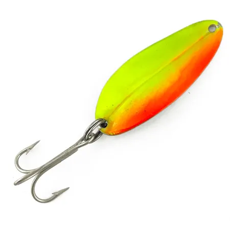 Tato plandavka o délce 5 cm se vyznačuje nápadným dvoubarevným provedením, kde neonová chartreuse přechází do výrazného oranžového okraje. Tento konkrétní exemplář s produktovým kódem 3706 patří do série Toddco Main Liner UV, kterou americká společnost vyráběla přibližně do roku 1980. Označení UV je funkčním prvkem, protože barva je navržena tak, aby při vystavení ultrafialovému světlu vydávala zřetelnou zelenou a oranžovou záři, což zvyšuje viditelnost v kalné vodě. Ražené kovové tělo o hmotnosti 11 g (2/5 oz) je osazeno stříbrným trojháčkem a kroužkem. Nástraha odráží svůj americký původ z poloviny století a je zachována ve vynikajícím stavu s hodnocením 5/5, včetně původního továrního lesku a čistých komponentů.