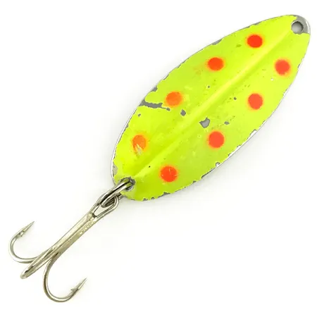Tato nástraha od TODDCO o délce 5,5 cm má ražené kovové tělo s výrazným středovým hřbetem, který definuje její podlouhlou oválnou siluetu. Tento model Main liner UV s kódem 6878 představuje americkou výrobu rybářských potřeb z éry končící v roce 1980. Povrchová úprava se skládá ze zářivě žluté fluorescenční barvy s jasně červenými tečkami na masivním niklovém podkladu. Při vystavení UV světlu přechází žlutý pigment do sytě neonově zelené záře, zatímco červené detaily zůstávají tmavé pro vysoký kontrast. Exemplář v zachovalosti 4/5 vykazuje běžné známky používání s mírnou ztrátou barvy podél hran a vyvýšené středové linie, což odhaluje leštěný niklový povrch. Plandavka váží 12,5 g a je vyvážena pro tradiční přívlač nebo trolling. Výbava zahrnuje ostrý trojhák upevněný pomocí kroužku v zadní části a čisté očko pro uchycení v přední části.