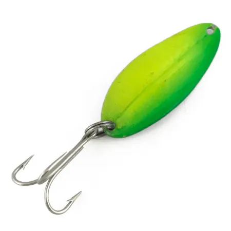 Hmotnost 11 g dodává této 5cm plandavce hustotu potřebnou pro efektivní nahazování do hlubších vrstev vodního sloupce. Tato nástraha TODDCO Main liner UV s kódem 7305 se vyznačuje zářivým žluto-zeleným přechodem, který zdůrazňuje její americký původ z doby před rokem 1980. Nejvýraznějším detailem je UV aktivní barva; jak je vidět na druhém obrázku, reaguje silným luminiscenčním jasem, což zvyšuje viditelnost za slabého osvětlení. Součástí je jeden upevňovací otvor a pevný kroužek s trojháčkem ve stříbrném tónu. Nástraha má hodnocení 5/5 a je ve vynikajícím stavu, přičemž lak i kovové části nenesou žádné známky používání nebo stáří. Středem konvexní strany prochází jemný podélný výstupek, který se plynule zužuje směrem k očku háčku.