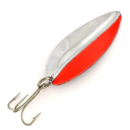Nikl a červená barva dominují povrchové úpravě této vintage plandavky TODDCO Main liner UV o hmotnosti 21g (3/4oz). Model 7518, vyrobený v USA před rokem 1980, se vyznačuje robustní konstrukcí určenou pro přívlač nebo trolling. Nejnapádnějším rysem je UV reaktivita; zatímco niklová strana nabízí vysoký kovový lesk, červená strana je opatřena fluorescenčním nátěrem, který pod ultrafialovým světlem září hlubokým oranžovým odstínem. Tato prezentace s dvojitým kontrastem je navržena tak, aby maximalizovala viditelnost v různých hloubkách. Exemplář o délce 6,5 cm (2 1/2") je vybaven pevným originálním trojháčkem. Zůstává ve vynikajícím stavu, za čistý povrch a absenci opotřebení získal hodnocení 5/5. Robustní spojovací kroužek podtrhuje odolnou kvalitu zpracování typickou pro éru výroby značky TODDCO.