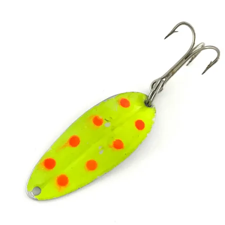 Žlutý lak a zářivě červené tečky zdobí přední stranu této TODDCO Main liner UV, klasické plandavky vyrobené v USA před rokem 1980. Nástraha o hmotnosti 11 g má niklovanou zadní stranu a robustní trojháček upevněný pomocí kroužku. Tento konkrétní model Main liner, označený produktovým kódem 7555, ukazuje na rané využívání fluorescenčních povrchů v designu vintage nástrah. Při vystavení ultrafialovému světlu se žlutý základ mění v jasně neonově zelenou, zatímco červené tečky si zachovávají výrazný, vysoce kontrastní jas pro dobrou viditelnost v hlubších vrstvách vody. Tento 5 cm dlouhý exemplář je ve stavu 5/5, přičemž jeho původní povrchová úprava zůstává sytá a kovové části lesklé. Zužující se tvar lžíce a těžká niklová základna předurčují nástrahu pro nahazování nebo vertikální přívlač.