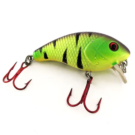 Vzory Fire Tiger, jako je tento na 6cm (2 1/4") těle, zůstávají základem pro podmínky s vysokou viditelností, kde je zapotřebí výrazná prezentace. Tento exemplář od Mann's Bait Company o hmotnosti 7 g (1/4 oz) je specializovaný mělce potápivý wobler, navržený tak, aby se při navíjení držel do 0,3 m (1 ft) od hladiny. Nástraha s produktovým kódem 11738 se vyznačuje charakteristickou čirou plastovou lopatkou typu squarebill a plovoucím tělem. Povrchová úprava je ve stavu 5/5, s jasně chartreuse bokem přecházejícím do tmavě fialového hřbetu, zdobeným výraznými černými svislými pruhy. Červené trojháčky jsou připevněny pomocí robustních kroužků a vytvářejí ostrý kontrast k břišnímu kování. Tento v USA vyrobený Baby 1-Minus obsahuje nápadné červené oči a detailní texturu šupin na horní části těla. Je to dobře zachovalý příklad malých crankbaitů, které vybudovaly pověst výrobce z Alabamy v oblasti hladinových prezentací.