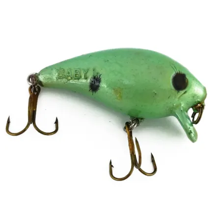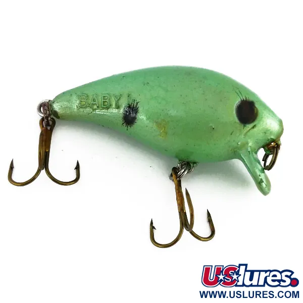 Hmotnost 1/4 oz (7 g) dává tomuto mělce potápivému wobleru váhu potřebnou pro přesné nahazování do hustých vázek. Návnada o délce 2 1/4" (6 cm) se vyznačuje perleťovým povrchem Green / Black a rozpoznatelným reliéfním razítkem „BABY“ na boku. Společnost Mann's Bait navrhla tento model tak, aby se držel v horní vrstvě vodního sloupce a dosahoval maximální hloubky pouhých 0,3 m (1 ft). Design zahrnuje jedinečný vzor očí s jemnými radiálními liniemi a jednu černou boční tečku, která je typická pro historické výrobní série z USA. K dispozici je veškerý původní hardware, včetně dvou robustních trojháčků a kroužku pro upevnění vlasce, což tomuto předmětu vynáší hodnocení stavu 5/5. Produktový kód 9711 je vylisován s krátkou, strmou potápivou lopatkou, která omezuje klesání a zároveň udržuje plovoucí vztlak.