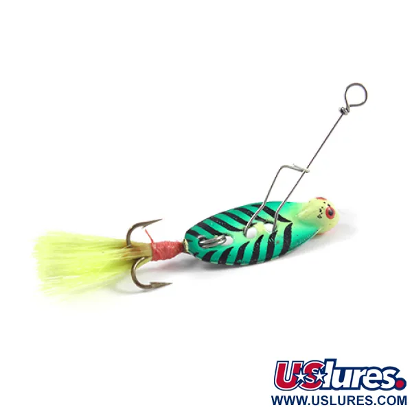 Vzor Fire Tiger na těle ve tvaru kapky zajišťuje vysokou viditelnost díky výrazným černým pruhům na zářivém zeleno-žlutém přechodu. Tento exemplář od Mann's Bait, katalogizovaný pod kódem produktu 2434, zůstává ve vynikajícím stavu 5/5, přičemž osazení i lak si zachovávají svůj původní tovární vzhled. S hmotností 1/8 oz (4 g) je konstrukce postavena na drátěném rámu a kovovém listu, který vytváří chvějivý pohyb pro generování vibrací. Ocas je vybaven péřovým trojháčkem, kde jsou jasně žlutá vlákna pevně zajištěna červeným ovinem nitě. Nástraha pocházející z USA se vyznačuje výrazným profilem hlavy s namalovanýma červenýma očima, které slouží jako cílový bod útoku. Drátěná konstrukce je vytvarována tak, aby umožňovala stabilní prezentaci a udržovala šňůru mimo vibrující tělo během používání.