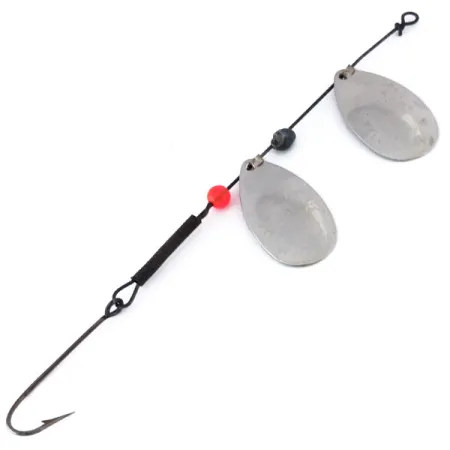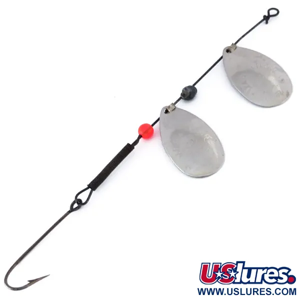Niklování pokrývá tandemové rotační listy této 12,0 cm (4 3/4") nástrahy, což zajišťuje jasný záblesk v různých vodních podmínkách. Nástraha váží 3,4 g (1/8 oz) a je postavena na tmavém drátěném dříku s jedním červeným korálkem, který slouží jako bod útoku mezi spodním listem a háčkem. Tandemová konfigurace využívá dva listy ve tvaru kapky k maximalizaci plochy při zachování štíhlého profilu pro nahazování nebo trolling. V zadní části je upevněn jednoháček s ostrým hrotem, zesílený černým pouzdrem pro stabilitu. Tato nástraha značky Marathon s produktovým kódem 10143 byla vyrobena v USA s důrazem na odolnost. Stav je hodnocen 4/5, vykazuje dobře zachovalý kovový povrch a čisté komponenty. Jednoduché drátěné očko vpředu umožňuje přímý uzel nebo použití malé karabinky.