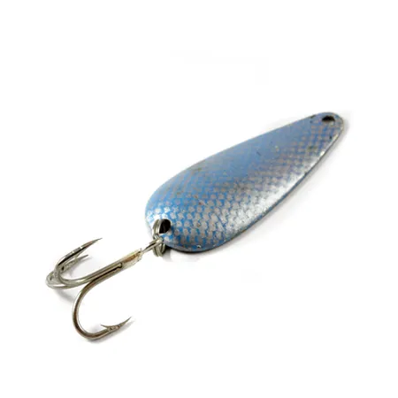 Výrazná modrá a niklová povrchová úprava se vzorem šupin pokrývá konvexní stranu této 6cm (2 1/4") plandavky a nabízí strukturovaný vzhled, který byl po desetiletí základem pro rybáře ve Wisconsinu. Ražba na niklové zadní straně ji identifikuje jako originální Marathon, vyrobenou společností Marathon Bait Company, která vyráběla nástrahy v USA v letech 1929 až 1979. S hmotností 9 g (1/3 oz) si tato plandavka zachovává svůj původní trojháček a nese kód produktu 3015. Její stav 4/5 se vyznačuje mírným opotřebením povrchu, které pod modrou barvou šupin odhaluje lesklé niklové tělo, čímž zůstává zachován vintage charakter, zatímco kov samotný zůstává čistý. Ražené písmo na zadní straně zůstává ostré a poskytuje jasné spojení s dlouhou historií výroby rybářského náčiní této společnosti na americkém Středozápadě.