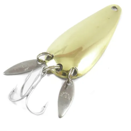 Do vnitřního zakřivení mosazného kovu je jasně vyražen název Marathon, značka wisconsinské společnosti, která působila v letech 1929 až 1979. Tato 6 cm (2 1/4") dlouhá plandavka má výrazné tělo se zlatou povrchovou úpravou spojené se dvěma stříbrnými protáhlými mini-lístky. Tyto pomocné sonické lístky jsou namontovány na kroužcích vedle stříbrného trojháčku a jsou navrženy tak, aby profilu dodaly dodatečný odlesk a vizuální členitost. Tato v USA vyrobená nástraha s produktovým kódem 3200 o hmotnosti 12 g (2/5 oz) se vyznačuje pevnou konstrukcí typickou pro řemeslné zpracování poloviny století, které najdete v katalogu Marathon. Stav je hodnocen 5/5, vykazuje jasný, čistý povrch, který si zachovává svůj původní kovový lesk. Kapkovitý tvar hlavního těla doplňuje kontrastní stříbro sekundárních lístků, které pomáhají maskovat hrot háčku a zároveň dotvářejí celkovou siluetu.