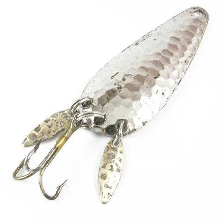 Textura tepaného niklu zachycuje světlo na širokém povrchu klasické plandavky od Marathon Bait Company. Tato nástraha vyrobená ve Wisconsinu pod kódem 3480 měří 6 cm (2 1/4") a váží 12 g (2/5 oz). Výrazným prvkem tohoto modelu jsou dvě malé „sonické“ lamely připevněné ke spodním kroužkům. Tyto minilamely poskytují dodatečné odlesky a napodobují pohyb ocasní ploutve, čímž pomáhají maskovat ostrý trojhǎček. Na hladké zadní straně je jasně vyražen název „MARATHON“, značka společnosti, která působila v USA v letech 1929 až 1979. Tepaná povrchová úprava na konvexní straně poskytuje mnohostranný reflexní povrch pro nahazování. Tento exemplář si udržuje hodnocení stavu 4/5, vykazuje dobře zachovalý hardware a čistý povrch.