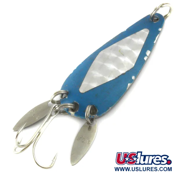 Niklový a modrý povrch definuje vizuální charakter této 6 cm (2 1/4") plandavky od společnosti Marathon Bait Company. Společnost Marathon se sídlem ve Wisconsinu v letech 1929 až 1979 vyráběla inovativní modely, jako je tento, který je vybaven dvěma malými pohyblivými listy „Sonic Blades“ v zadní části. Tyto podlouhlé niklové lístky jsou upevněny na kroužcích, aby vytvářely iluzi ocasu nástražní rybky a zároveň částečně maskovaly ostrý trojhlan. Nástraha o hmotnosti 12 g (2/5 oz) má na zadní straně vyražené jméno výrobce, což označuje její původ v USA. Přední strana plandavky obsahuje texturovanou vložku s diamantovým vzorem, která kontrastuje s lakovaným modrým okrajem. Tento exemplář, vedený pod kódem produktu 4130, je ve stavu 4/5, vykazuje zachovalý hardware a zářivé barvy, které odrážejí jeho historii jako základního rybářského vybavení poloviny minulého století. Kroužek v přední části poskytuje rybáři bezpečný bod pro upevnění vlasce.