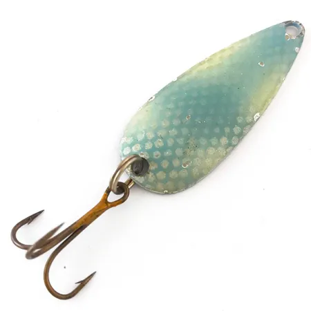 Výrazný světle modrý voštinový vzor šupin pokrývá konvexní stranu této klasické plandavky, což je charakteristický vzhled společnosti Marathon Bait Company. Tento exemplář z poloviny století o délce 4,5 cm (1 3/4") a hmotnosti 5,5 g (3/16 oz) představuje vrchol historie výroby nástrah ve Wisconsinu. Otočením nástrahy odhalíte čistý poniklovaný povrch s vyraženým názvem „MARATHON“ v elegantním oblouku, který ji identifikuje pod produktovým kódem 4161. Společnost působila ve Wausau ve Wisconsinu v letech 1929 až 1979 a kousky jako tento ukazují, proč zůstaly stálicí po padesát let. Výbava zahrnuje pevný kroužek připevněný k dobovému trojhůčku, který vykazuje lehké známky stáří. Stav je hodnocen 4/5, přičemž si zachovává většinu původního laku a reflexního povrchu. Byla navržena pro lehké nahazování nebo trolling, kde kapkovitý tvar a rozložení hmotnosti plandavky umožňovaly udržet se hluboko ve vodním sloupci.
