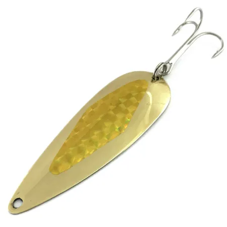 Gleaming with a dual-finish design, this 2 3/4" (7 cm) spoon features a gold-plated front face complemented by a polished nickel reverse. Stamped into the silver-colored backside is the bold 'MARATHON' maker's mark, a hallmark of the Wisconsin-based Marathon Bait Company that operated from 1929 to 1979. A prominent geometric holographic prism tape is centered on the gold side, catching light from multiple angles for increased visibility. Weighing 1/2 oz (14 g), the lure is robustly constructed for casting or trolling and comes equipped with an original silver-tone treble hook. Listed under product code 9489, the specimen is in 5/5 condition, displaying a bright surface that reflects its high-quality American heritage.