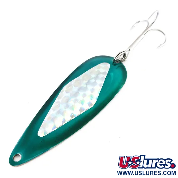 Ražba na zadní straně jasně zobrazuje název Marathon, což je odkaz na společnost z Wisconsinu, která působila v letech 1929 až 1979. Zářivě zelená povrchová úprava na niklovém základě definuje tuto konkrétní plandavku s produktovým kódem 9971. Centrální holografická vložka s diamantovým vzorem dodává lící nástrahy vizuální texturu. S délkou 7 cm (2 3/4") a hmotností 14 g (1/2 oz) poskytuje kovové tělo výrazný profil pro nahazování nebo trolling. Zadní strana je z čistého reflexního niklu, což vytváří klasický kontrast k smaragdově tónované přední části. Vzhledem ke stavu 5/5 zůstalo osazení i povrchová úprava pozoruhodně zachovalé, od ostrého trojháčku až po bezpečný spojovací kroužek.